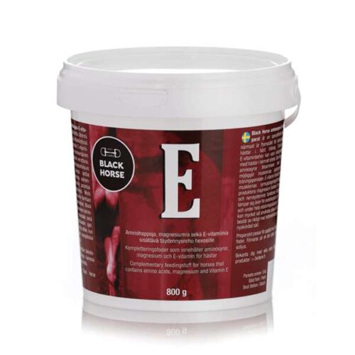 - Black Horse aminohappo-E-vitamiinivalmiste on tarkoitettu lähinnä kovassa valmennuksessa ja kilpakäytössä oleville hevosille. Kilpahevosten E-vitamiinitarpeen uskotaan olevan moninkertainen muiden hevosten tarvekuluihin verrattuna. Valmisteen korkea aminohappopitoisuus, treoniini, lysiini ja metioniini, yhdessä E-vitamiinin kanssa auttaa lihasmassan muodostamisessa valmennuskauden aikana.