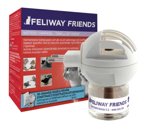 Feliway Friends on hajuton kissoille suunniteltu tuote, jolla ei ole vaikutusta kissan tietoisuuden tasoon eikä ihmisiin ja muihin eläimiin. Feliway Friends ei ole lääke. Jos epäilet kissallasi olevan sairauden oireita, ota yhteyttä eläinlääkäriin.