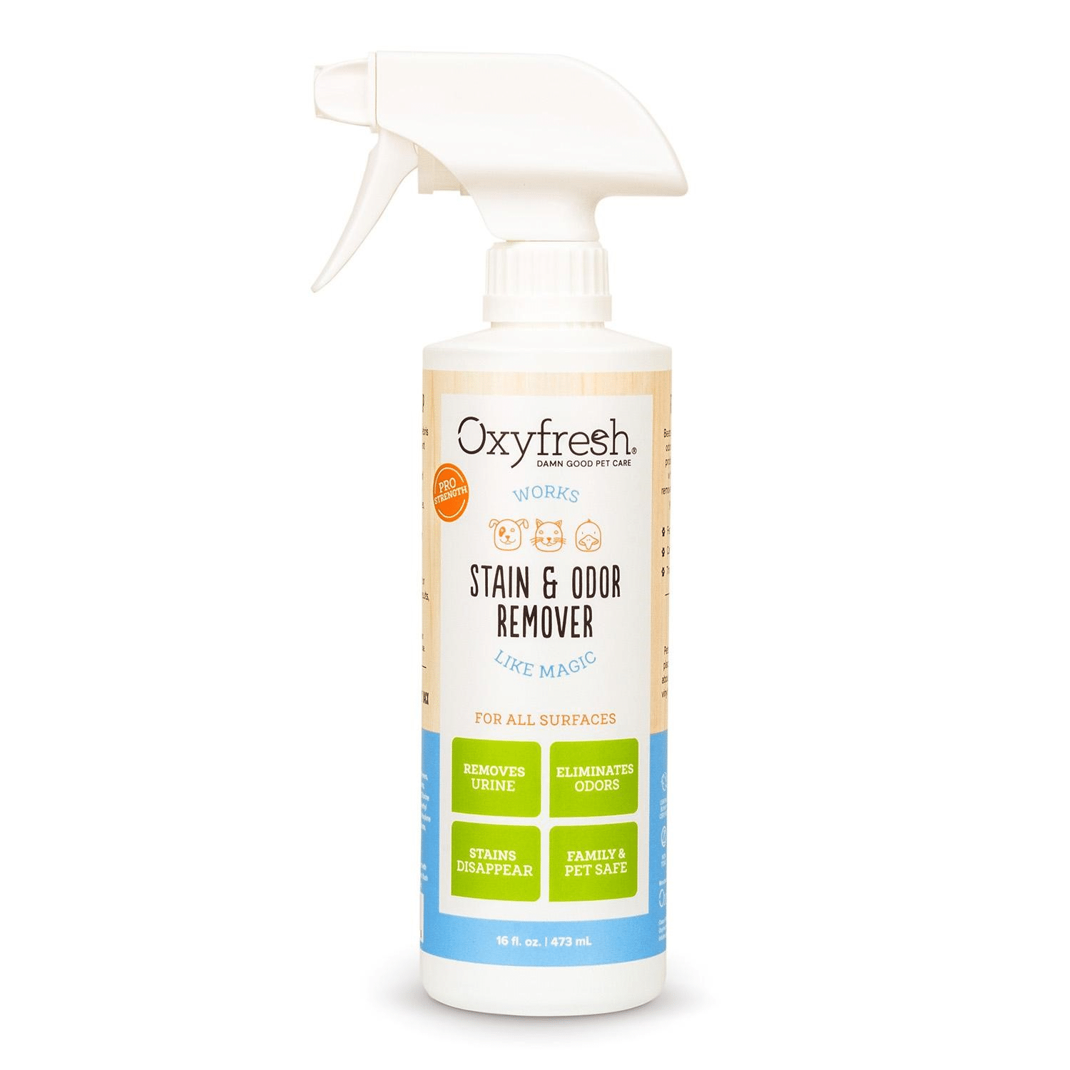 Oxyfresh Advanced Pet Stain & Odor Remover 473ml, Tahranpoistoaine sekä hajunpoistoaine samassa pullossa. Jokaisen lemmikkikodin pelastaja! Poistaa tehokkaasti lemmikkien jättämät oksennus-, uloste- ja virtsatahrat sekä hajut erilaisilta pinnoilta tehokkaasti ja turvallisesti. Mikään tahra ei ole liian kova, eikä mikään pinta ole este.